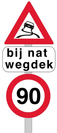 __________ Achtergrond bij 33c: er is een rechterlijke uitspraak uit 2003 over de betekenis van de volgende samenplaatsing van drie verkeersborden: Uitsmijter: Is op grond hiervan te concluderen wat de betekenis is van het samenstel van drie borden langs de A6 dat hieronder is getoond? |